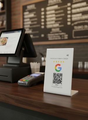 Dual Technology: Built-in high-speed NFC chip for "Tap to Review" and a high-resolution QR code for "Scan to Review."